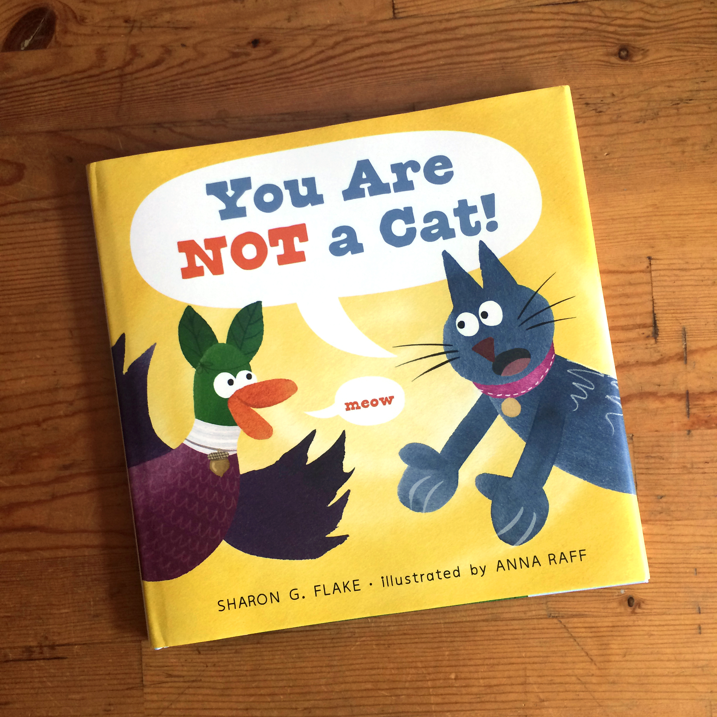This fall, Boyds-Mills Press will publish YOU ARE NOT A CAT, the first picture book by multiple award-wining author Sharon G. Flake. In short, it's the story of a duck who wants to let his freak flag fly, and a cat who doesn't quite get it. This book was expertly edited by Mary Colgan, and gorgeously art-directed and designed by the great Sara Gillingham. A few weeks ago, an advance copy arrived in my mailbox, and before I reveal any interior art, I thought it might be fun to share one of my favorite secret things about this book here. Okay, not so secret…but if you don't take off the jacket, you might never know…